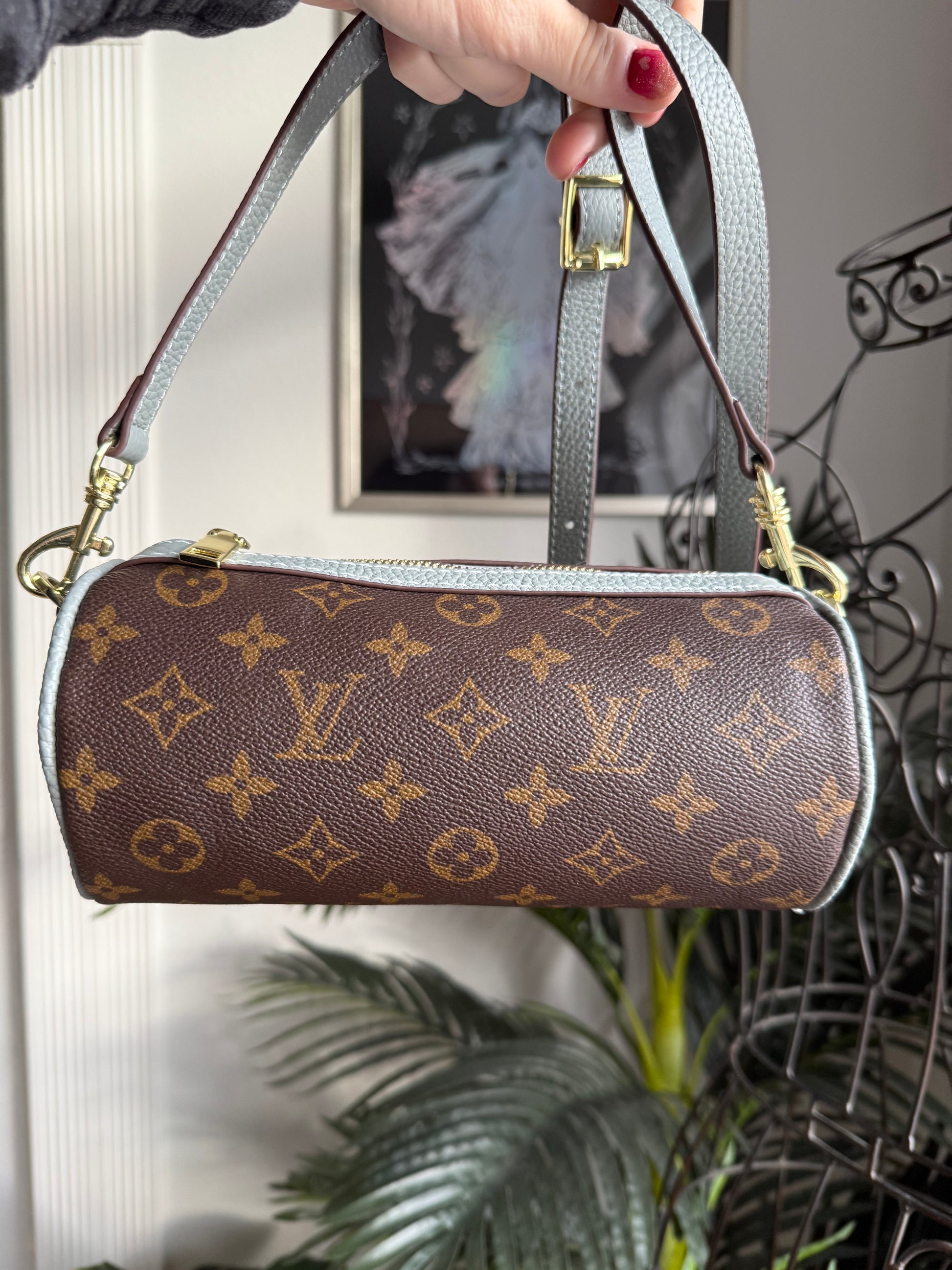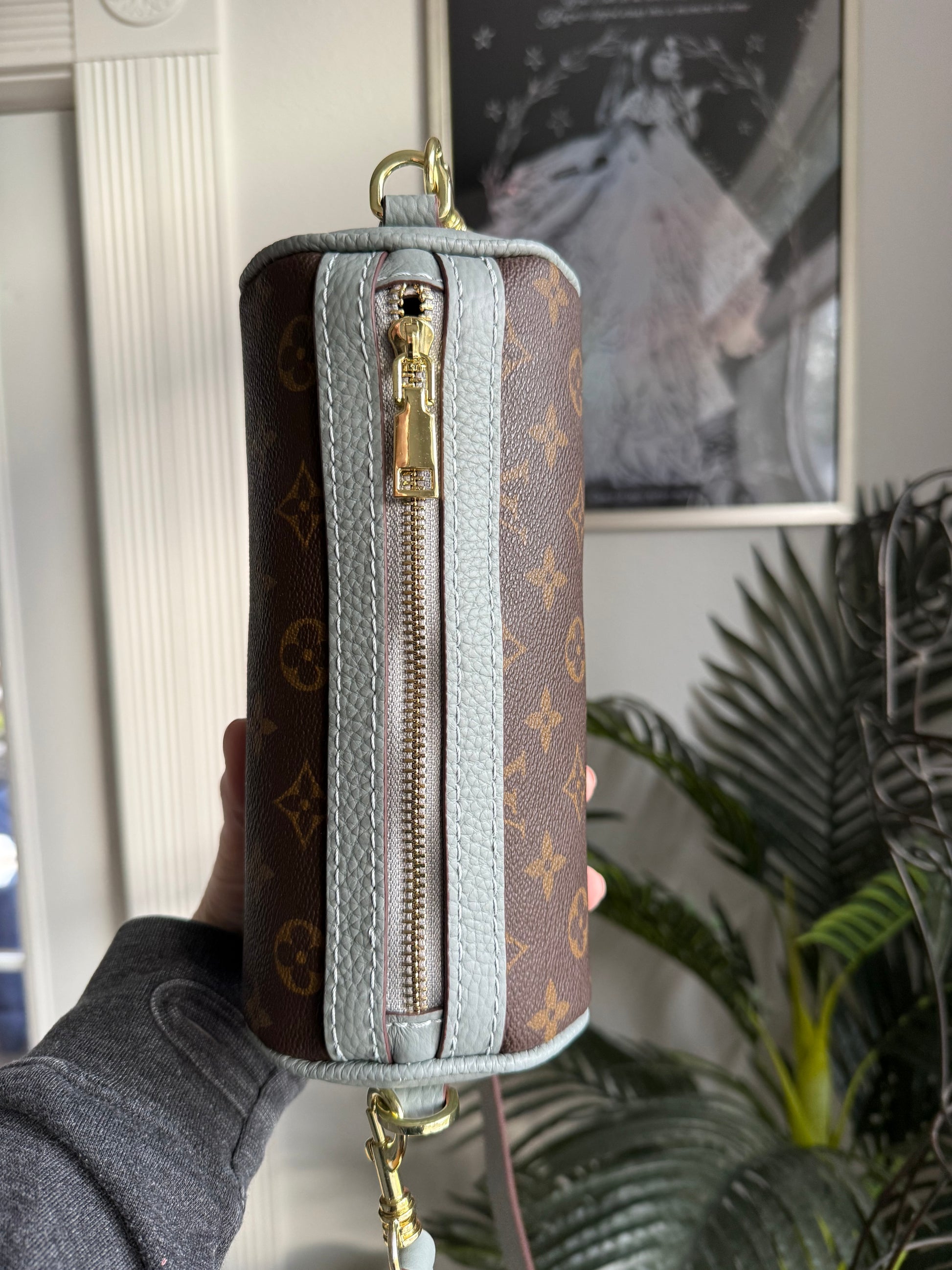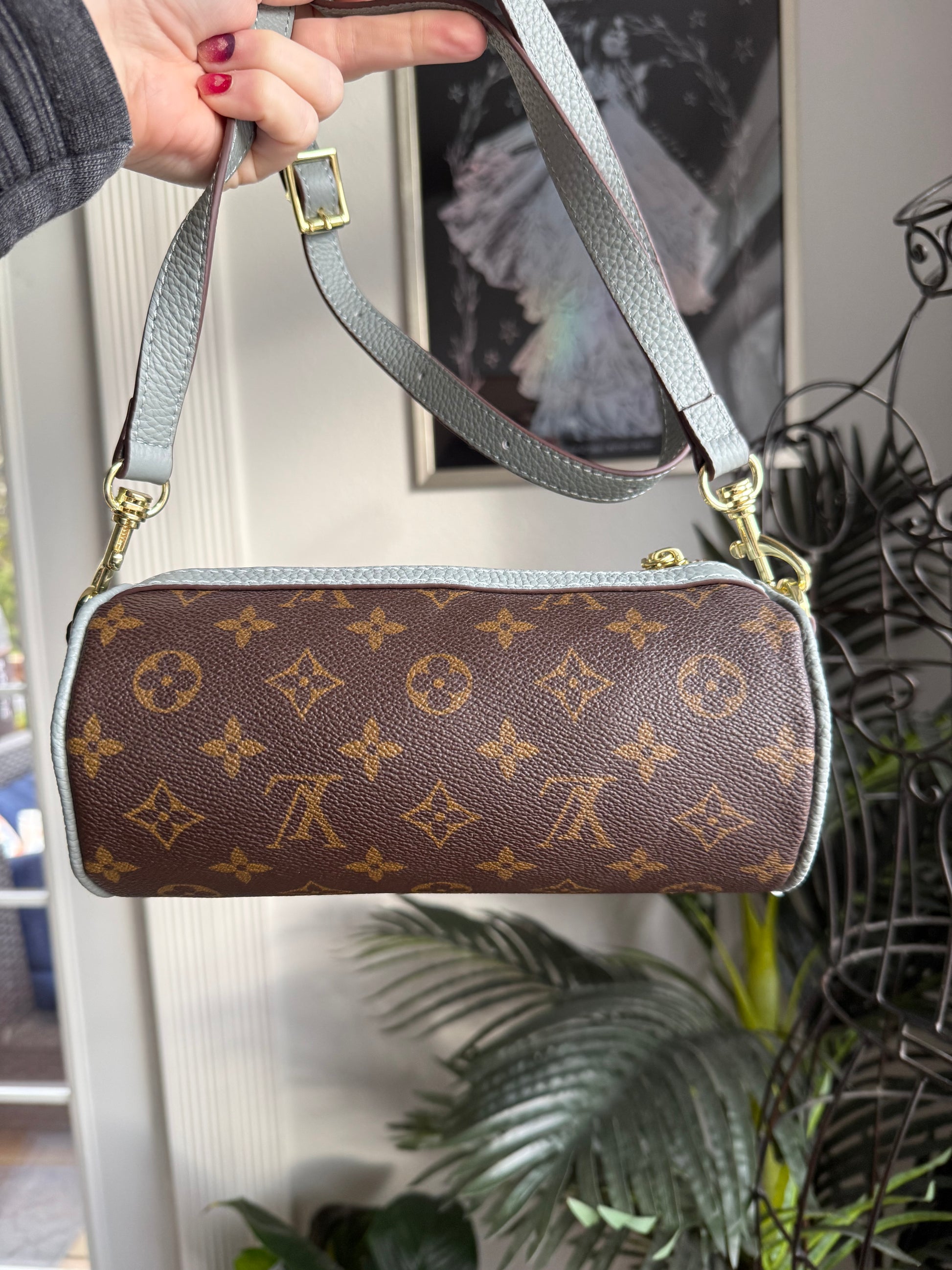 - Handsewn (by me in the PNW!) dusty blue color top grain pebble leather and authentic mono canvas from a vintage salvaged bag