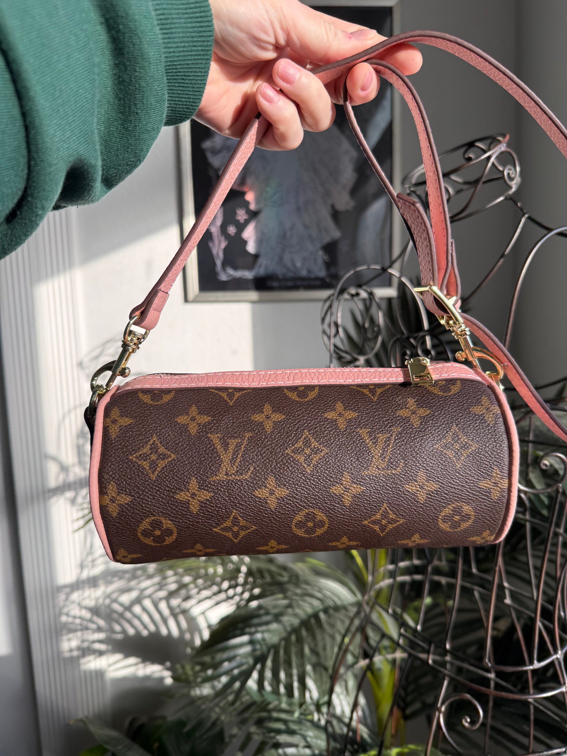 - Handsewn (by me in the PNW!) dusty pink color top grain pebble leather and authentic mono canvas from a vintage salvaged bag