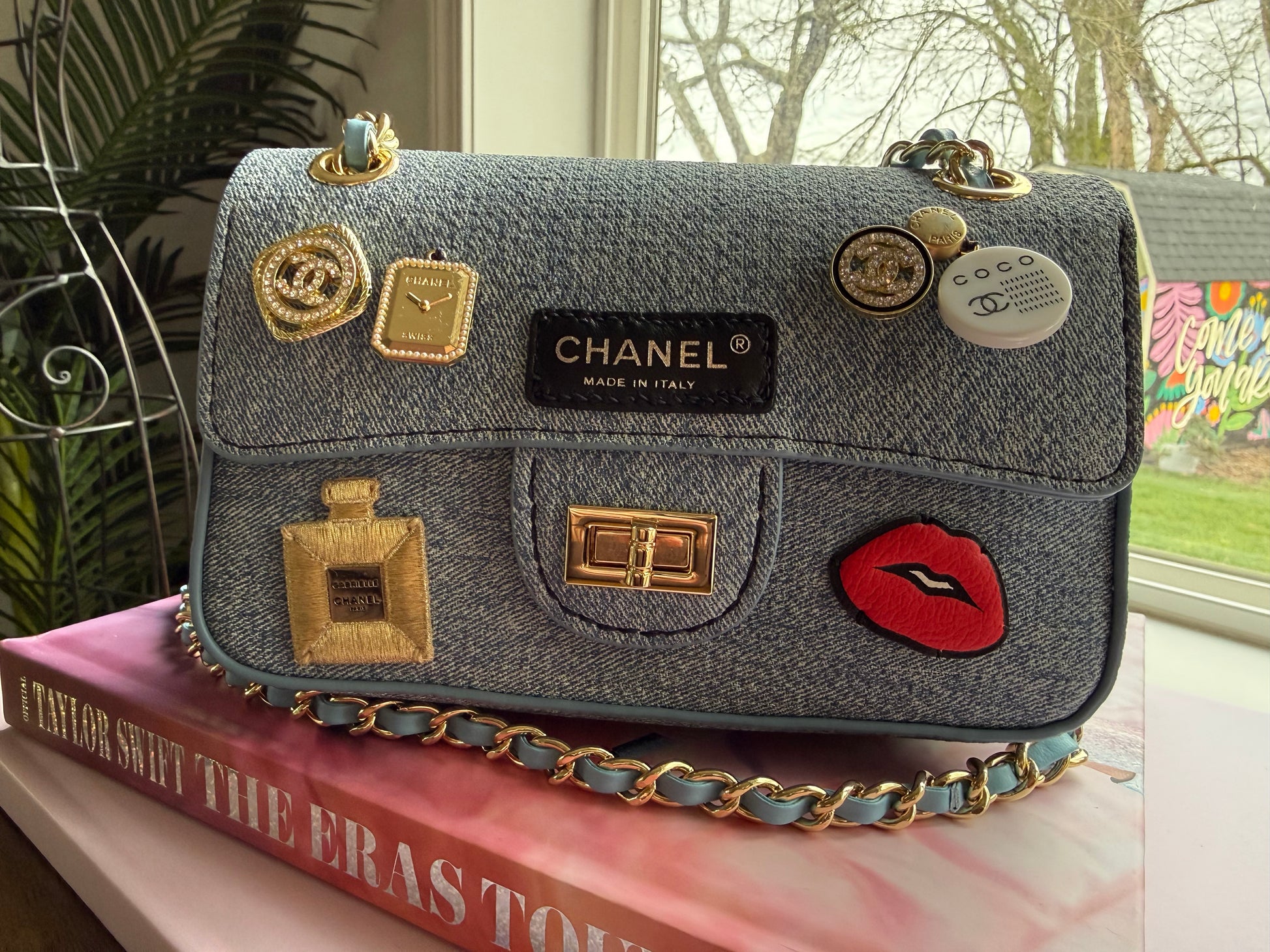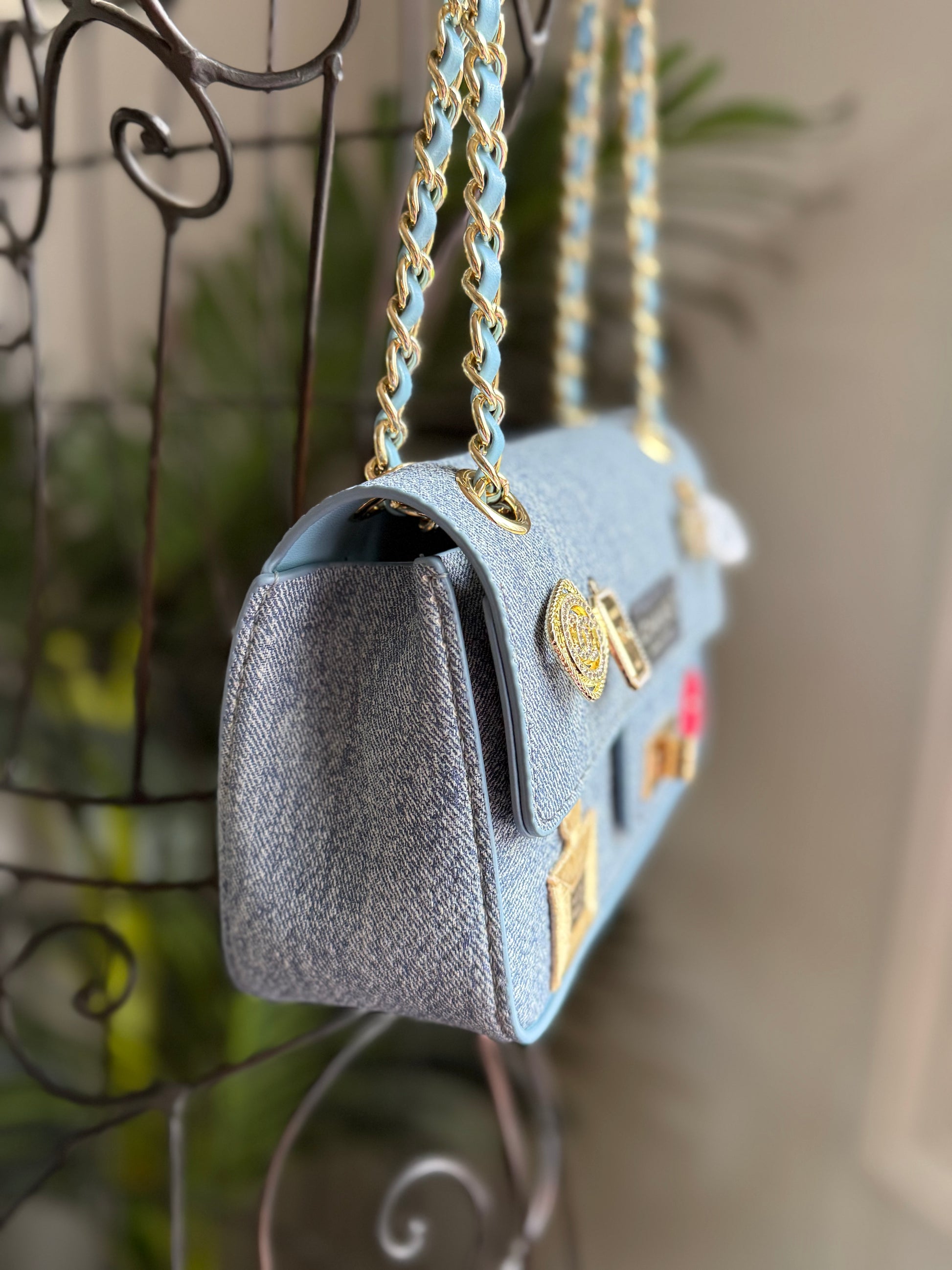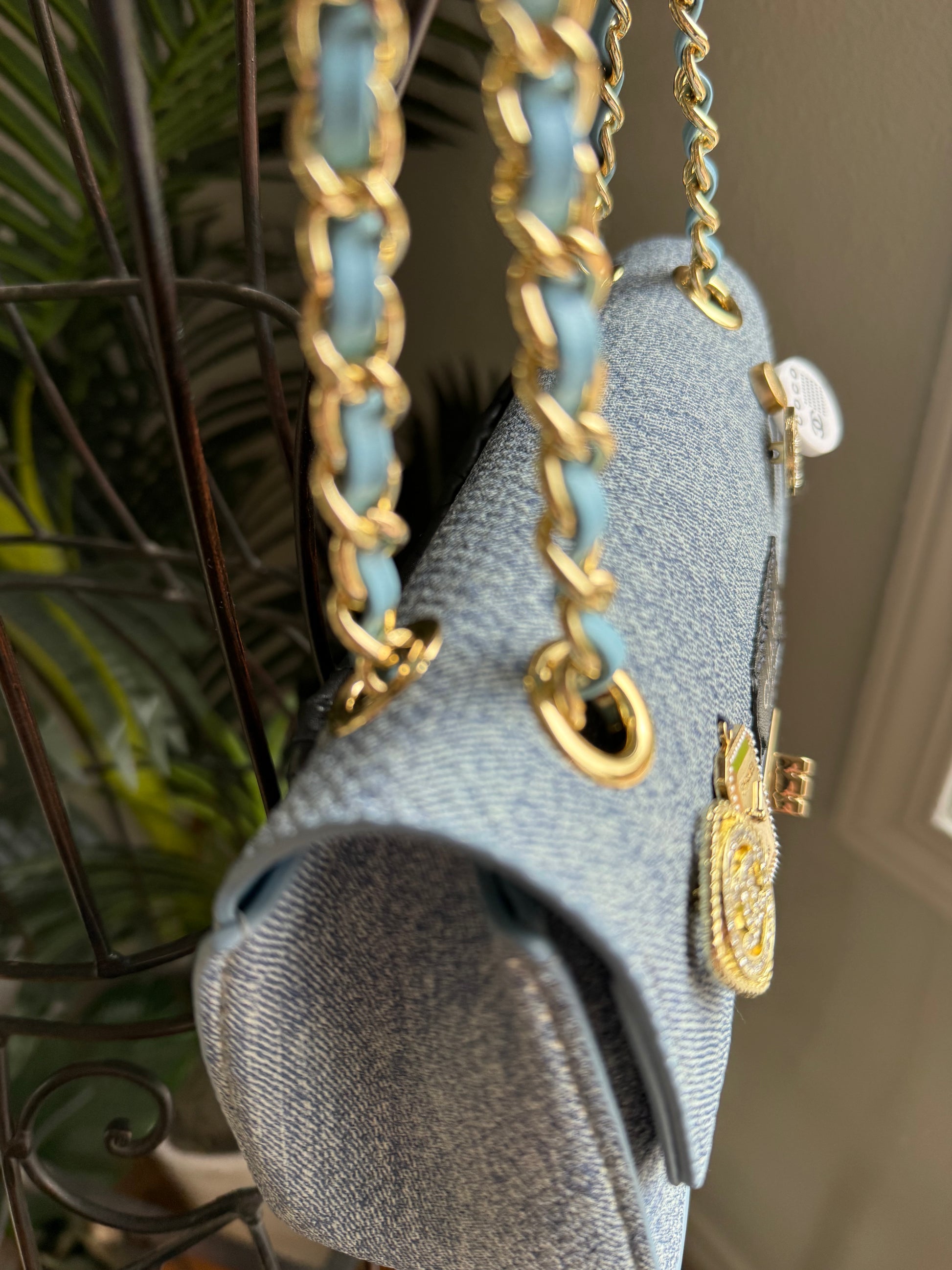 This handmade bag features gold tone hardware and is made with denim textured vegan leather and authentic vintage charms, cc patches and leather from an authentic cambon line wallet on back pocket.