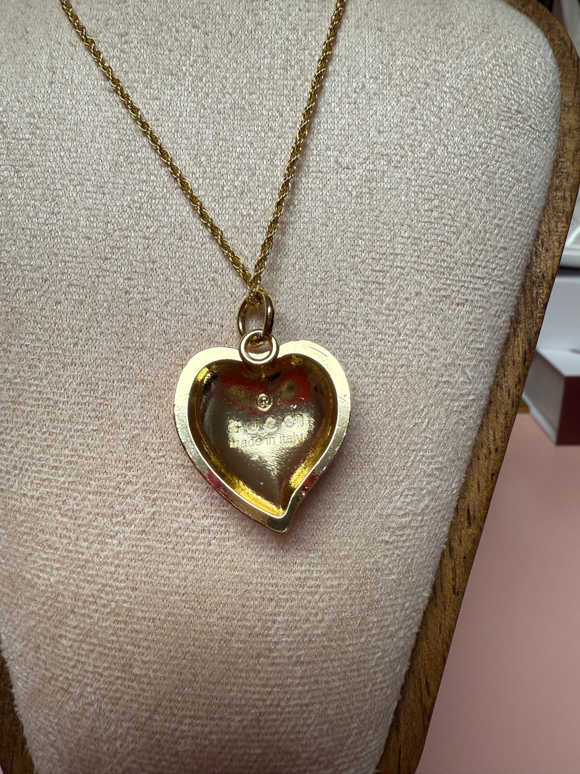 Upcycled preloved salvaged GG gold tone heart charm with orange and purple enamel and branding on both sides