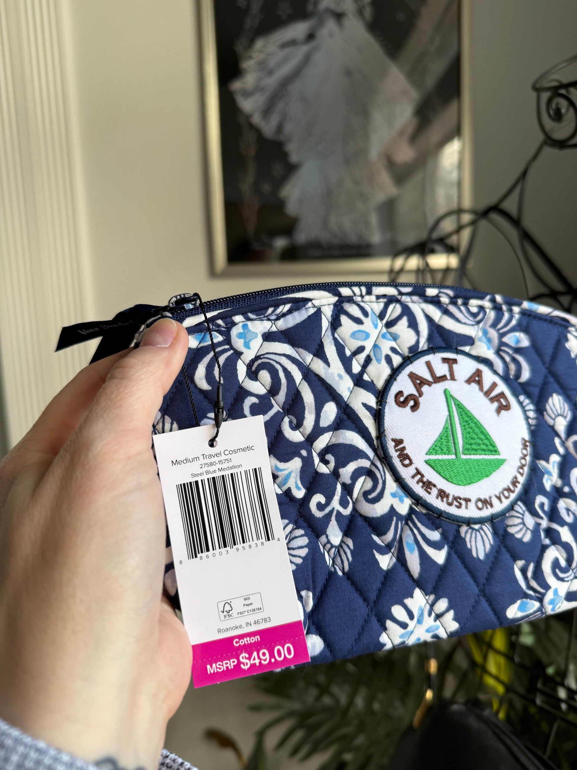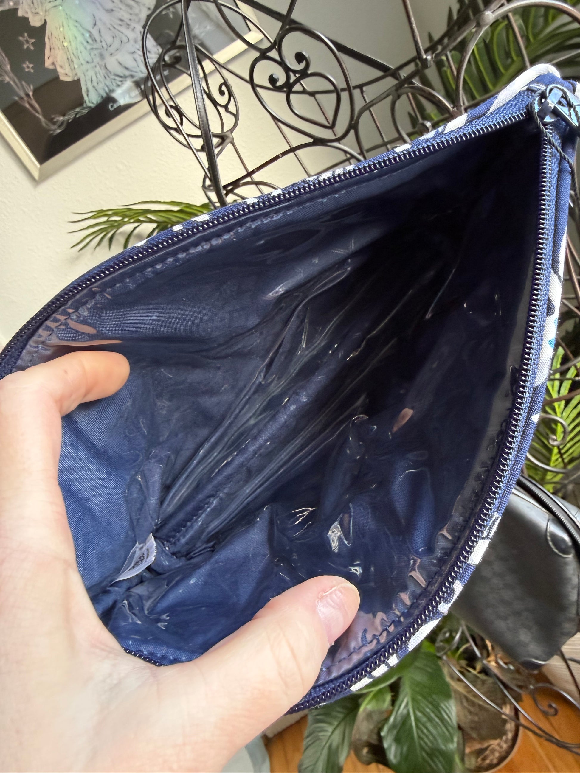 NWT cotton cosmetics bag with pvs lining and embroidered patch