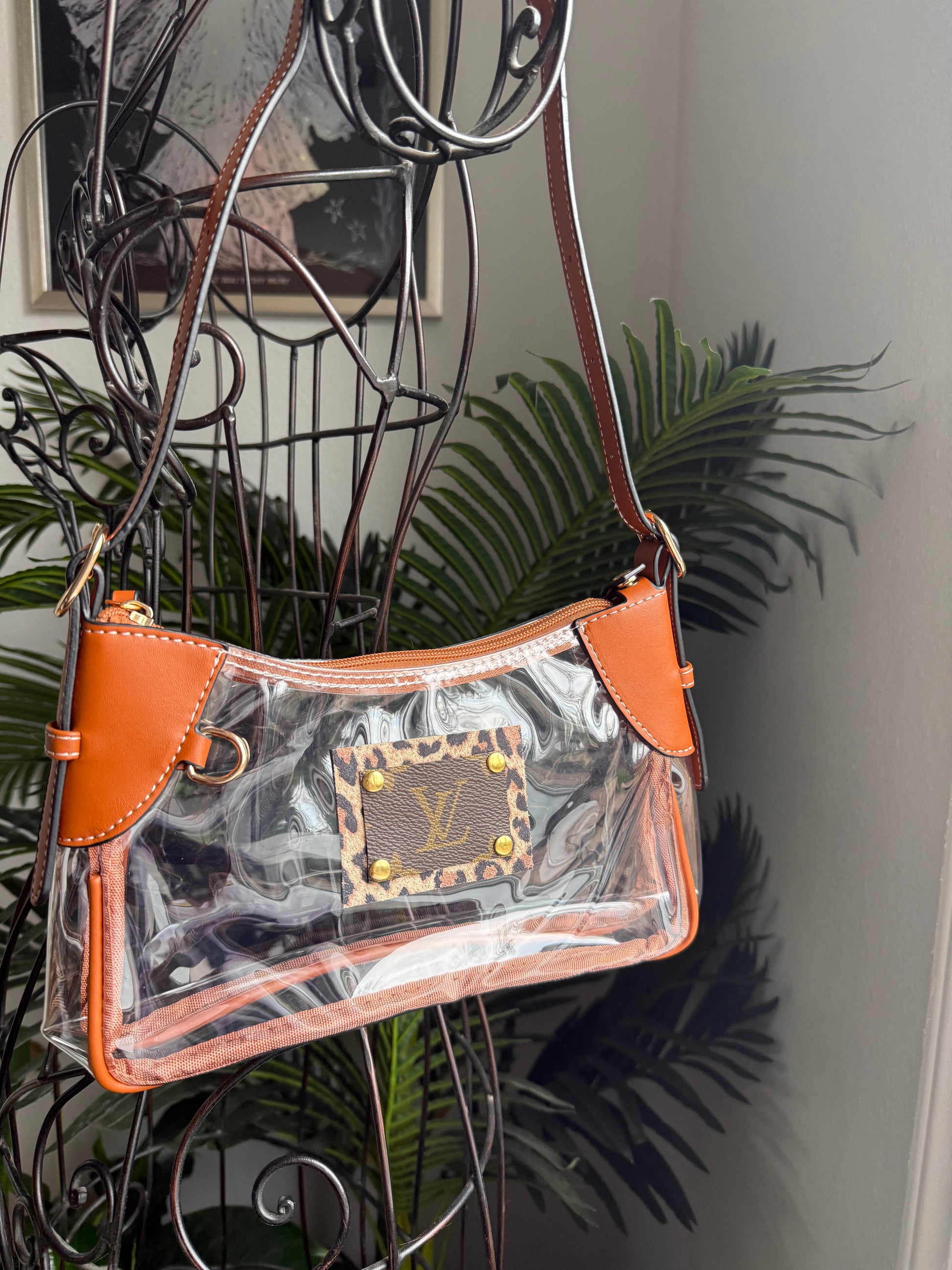 Clear stadium bag with tan vegan leather trim and authentic mono patch backed in animal print leather with hand set rivets