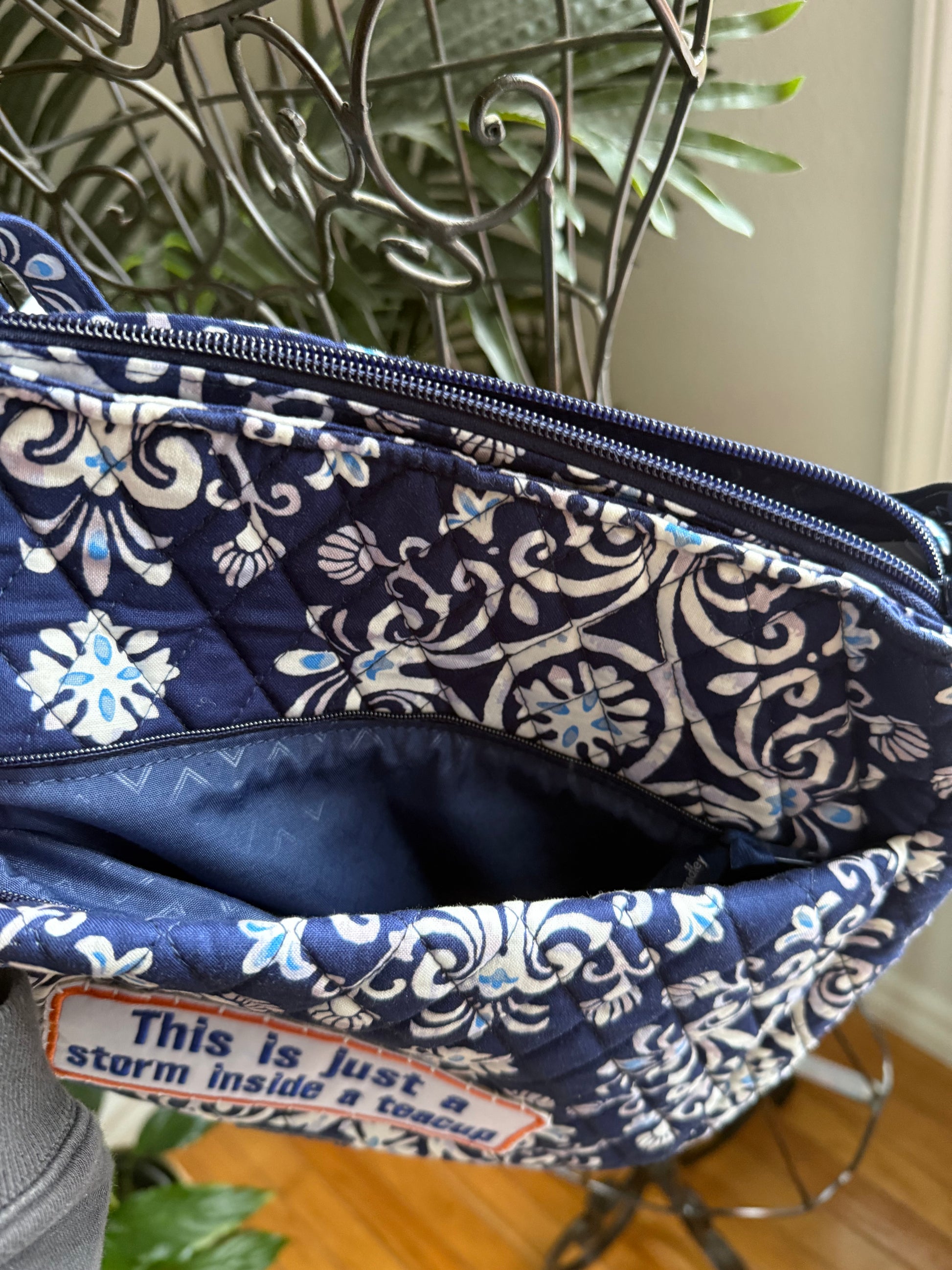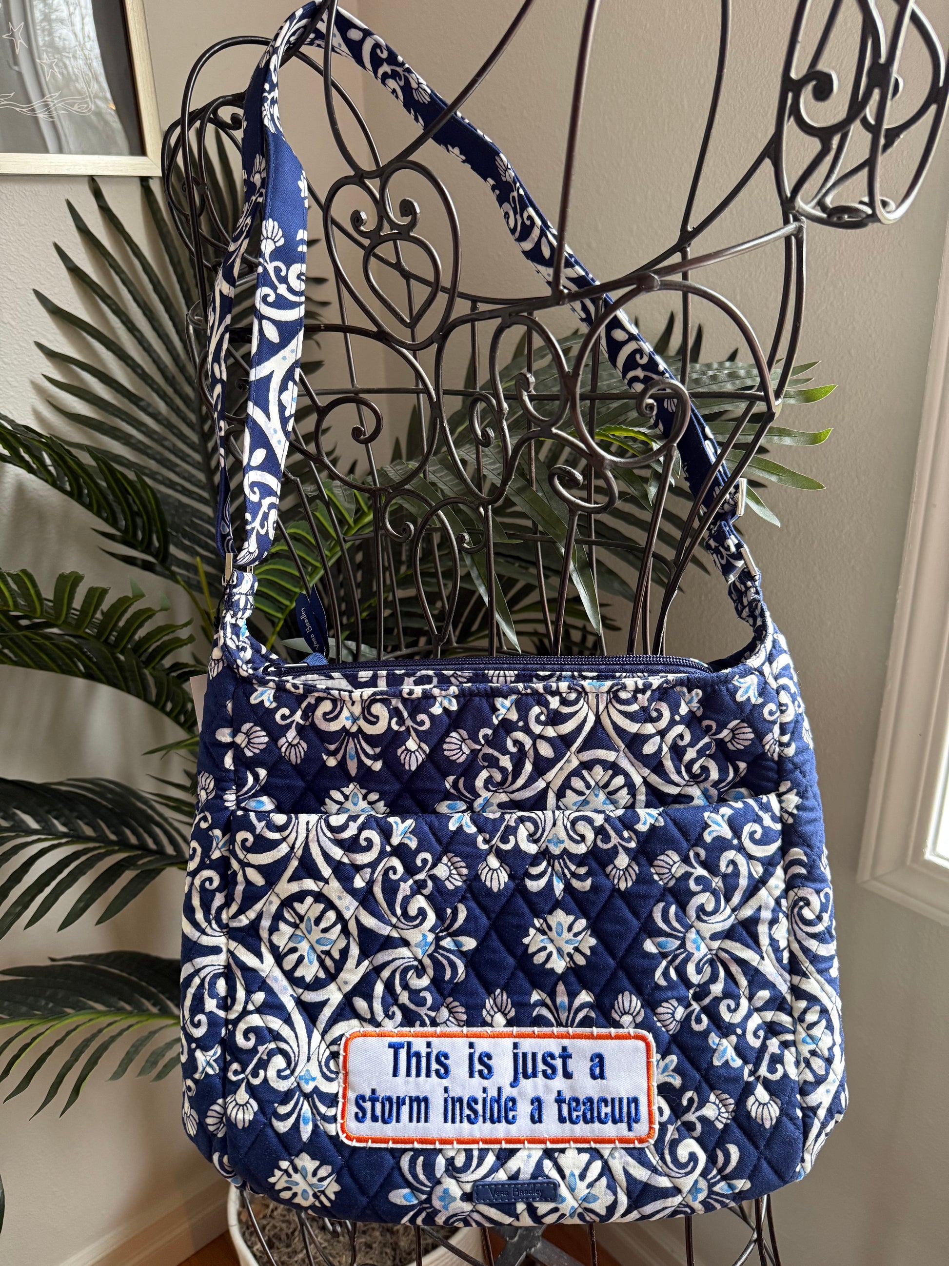 New with tags; reimagined authentic V Bradley XL crossbody in quilted cotton/steel blue medallion