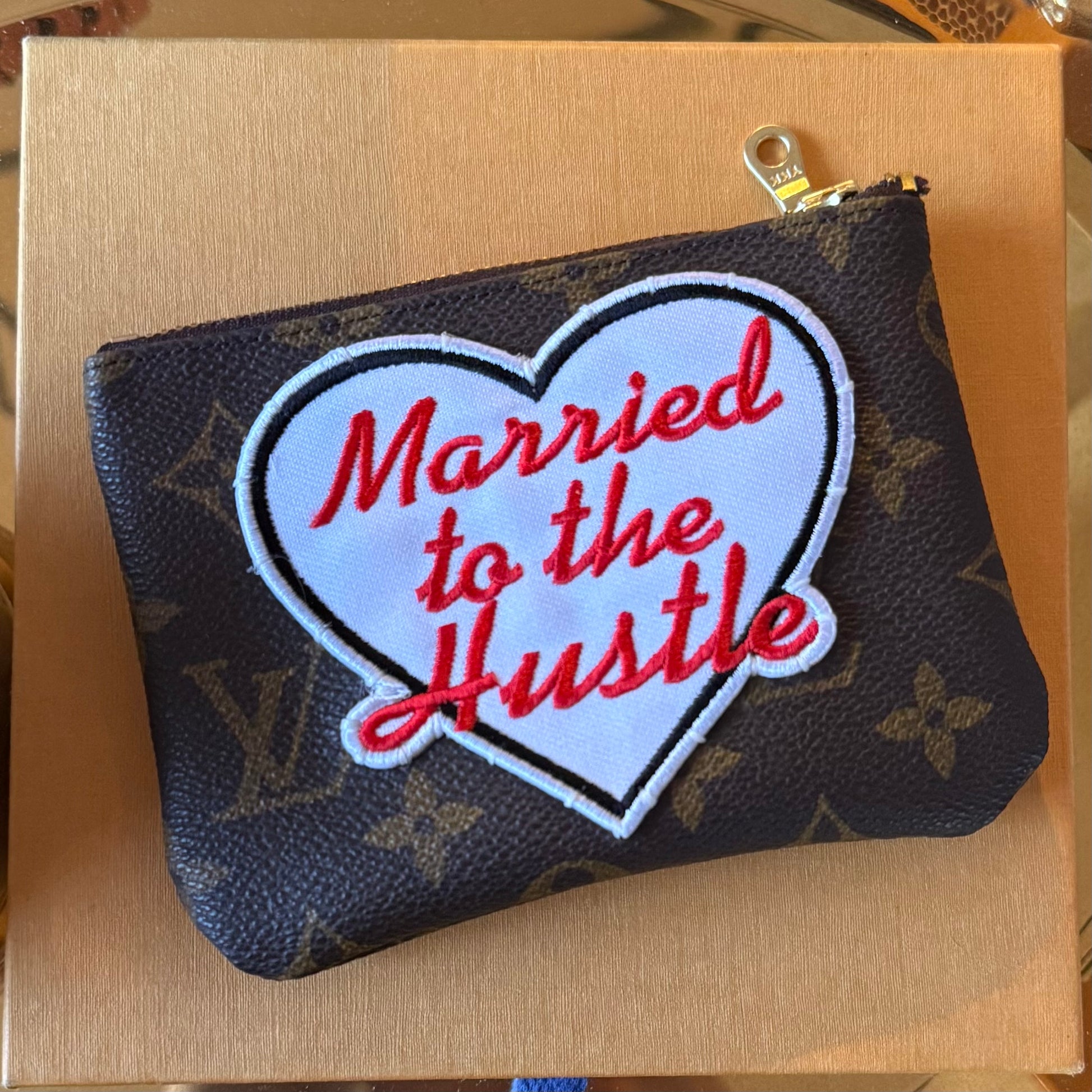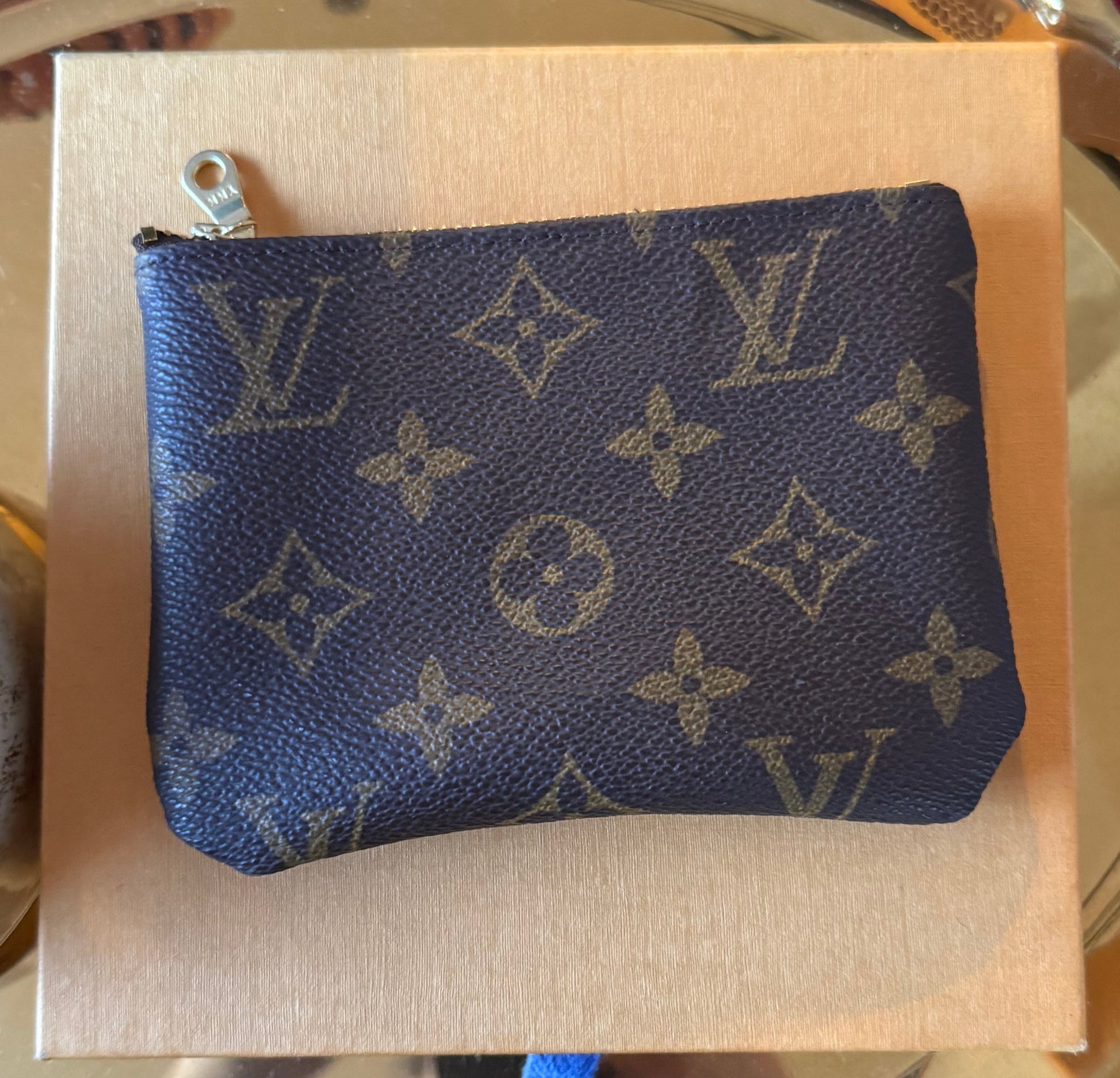 Handmade zippy wallet with salvaged authentic mono canvas on front and back and handsewn on embroidered inspired patch. The perfect size for cash and cards!